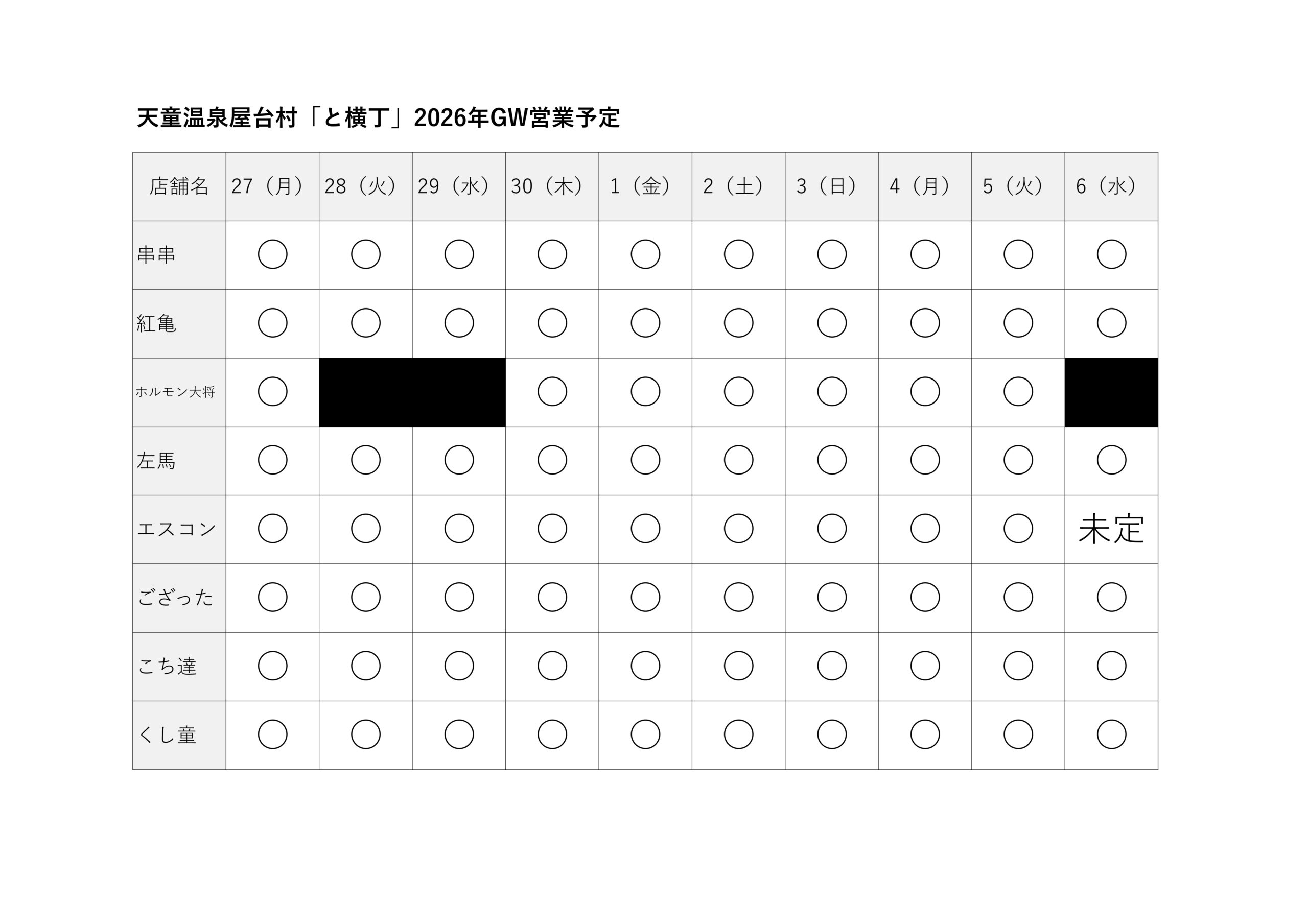 2026年GWの営業は下記の通りです 皆さんのお越しをお待ちしてます!